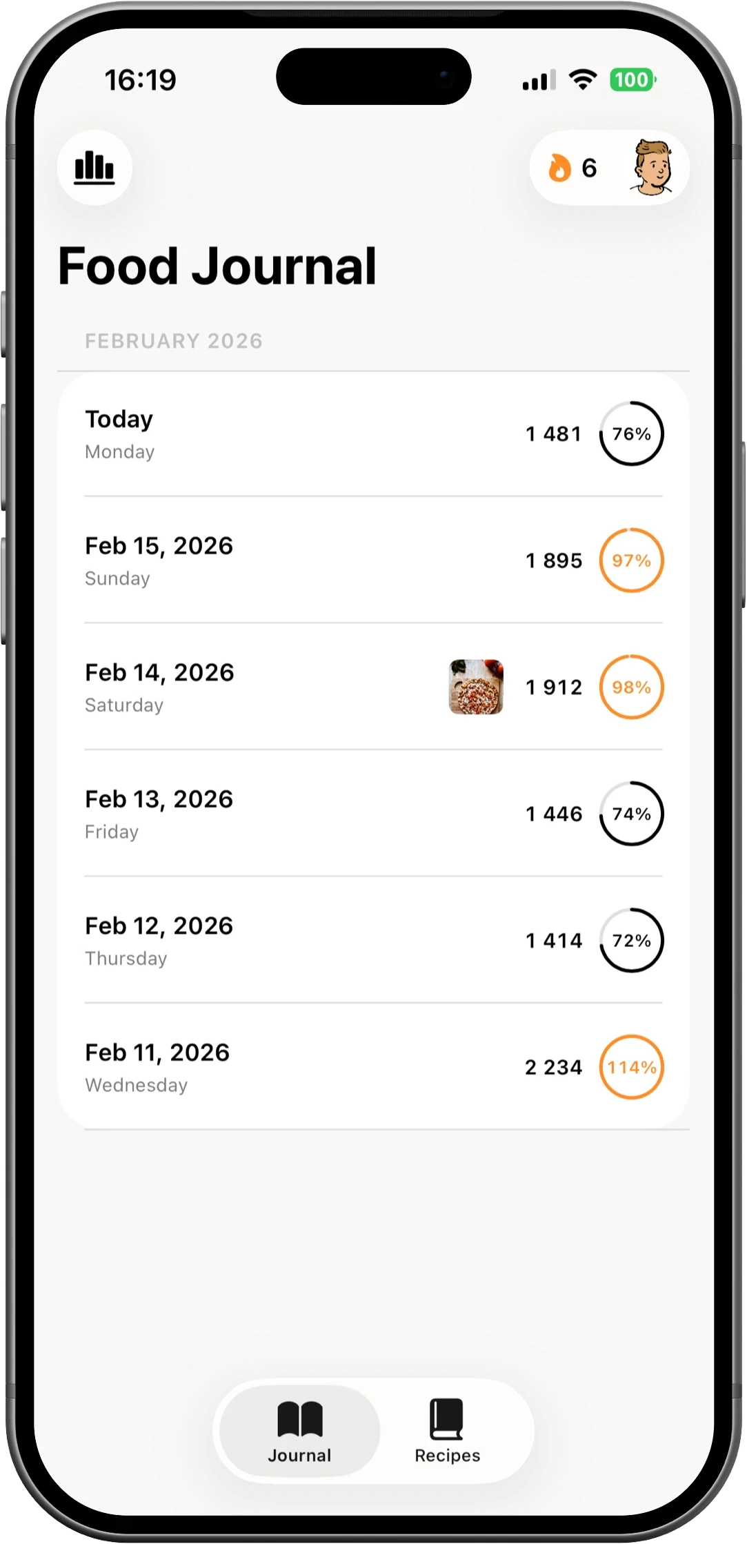 See your food journal as a clean daily list with totals calculated automatically.