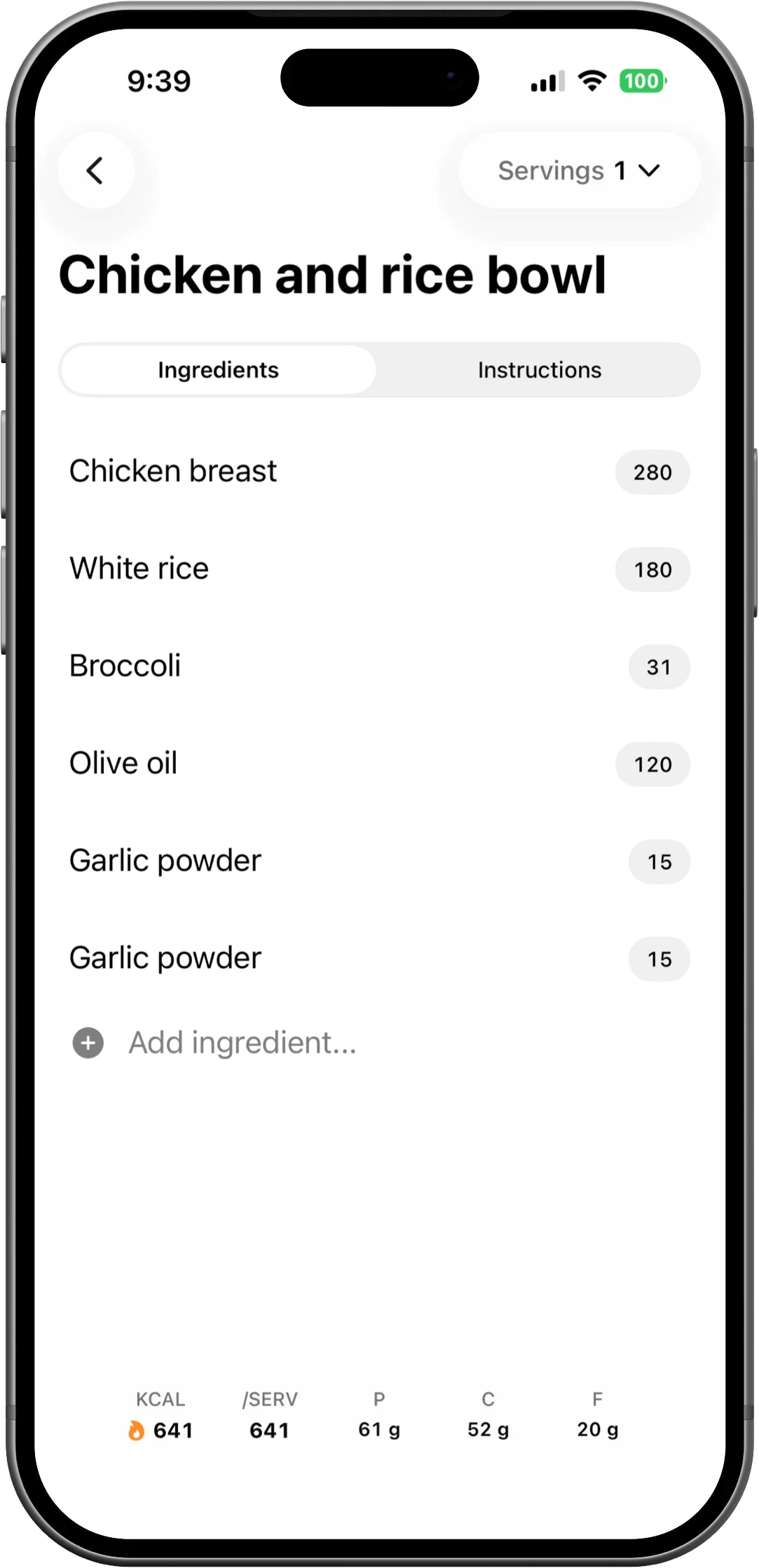 Save your recipes with ingredients and steps. Each ingredient is analyzed, and totals are calculated for the whole dish.